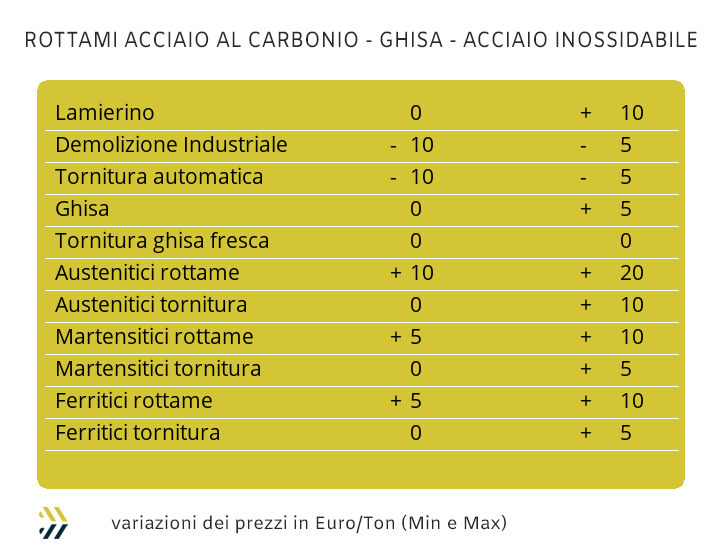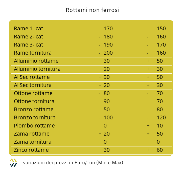 Le recentissime giravolte del listino LME hanno dato una nuova fisionomia ai prezzi di mercato dei rottami non ferrosi e dove su versanti opposti di segno, Alluminio e Rame hanno rimodulato i loro nuovi riferimenti. Il rinforzo del prezzo dell’Alluminio in Borsa è stato frutto anche della non brillantissima settimana dell’Euro e che su base settimanale ha ceduto quasi un punto rispetto alla moneta statunitense. I rottami di Alluminio segnano un rinforzo tra i 30 e 50 Euro per tonnellata, a seconda del livello del grado di metallo presente in composizione. La forza del Dollaro è stata invece utile per il Rame e relative leghe a frenare le discese dei prezzi, con la parte “rossa” che ha registrato un contenimento medio nell’intervallo compreso tra i 200 e i 150 Euro per tonnellata e la lega di ottone una diminuzione massima di 100 e grazie anche alla sostenuta rivalutazione dello Zinco. Il Nichel, seppure nell’ombra di un listino di Borsa relativamente appannato è riuscito a portare numeri positivi su alcuni rottami austenitici, in particolare per quelli riferiti all’AISI 304L, mentre invariati sono risultati quelli delle altre specifiche, duplex compresi. La proiezione positiva dei prezzi dei rottami di acciaio in Turchia è in piena evoluzione, contrariamente a quanto si poteva supporre una decina di giorni fa. L’HMS 1/2 con resa CFR ha registrato un progresso settimanale di 5 USD per tonnellata e quello di ambito domestico con punte fino a 7 Dollari. Una visione diametralmente opposta rispetto a quanto sta avvenendo sulla piazza italiana, dove acciaierie e fonderie hanno dato disposizioni alle mandatarie di comprimere i prezzi di molte classifiche e particolarmente per le demolizioni e le torniture, scese tra 5 e 10 Euro. Gli aspetti positivi non sono comunque mancati e hanno riguardato il “premio mulino” per il frantumato E40, passato a 60 Euro e l’incremento del riferimento settimanale del lamierino E8, fino a 10 Euro e con il chiaro intento di convincere i commercianti nell’incrementare il conferimento di questa preziosa classifica presso gli impianti fusori. L’andamento settimanale dell’indice MetalWeek™ si chiude in negativo, con il valore medio di acquisto dei rottami da parte di acciaierie e fonderie a 300,66 Euro e in flessione di 1,87 per tonnellata rispetto al valore di otto giorni fa. |