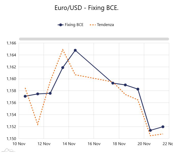 Euro in rimonta, ma la parità virtuale si allontana: la soglia di 1.1550 (+0.26% sul fixing del 21/11) è stata superata, ma l'Euro resta mezzo punto percentuale sotto l'allineamento stimato appena otto giorni fa |