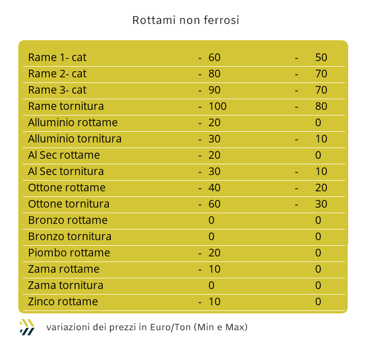 Si intensificano i segnali di un calo dei prezzi dei rottami di acciaio, con avvisaglie sempre più forti dalla Turchia. Per quanto riguarda i non ferrosi, i valori mostrano un lieve movimento al ribasso, principalmente dovuto alla debolezza del Dollaro nei confronti dell'Euro |