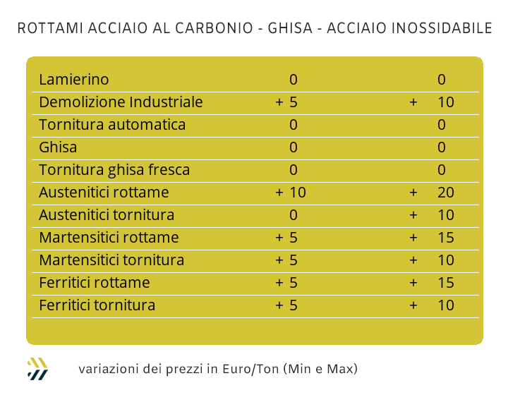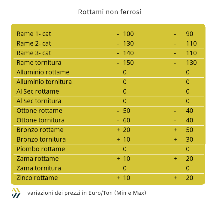 Le ultime battute della seduta che ha concluso la settimana di Borsa degli “industriali” hanno portato al diffuso ridimensionamento dei valori di molti metalli rispetto ai massimi visti otto giorni fa, in particolare per il Rame, l’Alluminio e in Nichel. Una situazione che per il nostro mercato dei rottami di metalli e leghe ha dovuto seguire una correzione penalizzante per la debole ripresa del Dollaro nei confronti dell’Euro, ricollocatosi ai livelli di fine novembre. Le strette sulle riduzioni delle quotazioni settimanali dei rottami hanno parzialmente penalizzato i commercianti, seppure le quotazioni continuino a mantenersi poco “orecchiabili” per fonderie e raffinerie. Il gruppo del Rame ha registrato una flessione di circa 100 Euro per tonnellata, la sua lega più importante, l’Ottone, ha fatto segnare una contrazione settimanale di circa 40, mentre sono risultate invariate le quotazioni dell’Alluminio. Il Nichel non ha interrotto la sua forma di condizionamento nelle determinazioni dei rottami di inox austenitico, che hanno mantenuto le indicazioni di rivalutazione indicate mediamente nei 20 Euro, ma per alcune leghe come i duplex o altre in presenza di Nichel superiore al 14%, l’entità di correzione prezzo è stata superiore ai 30 per tonnellata. L’influenza turca non si attenua nelle determinazioni delle quotazioni dei rottami di acciaio sulle piazze europee e in particolare per quella di casa nostra. Nello specifico, il valore del rottame HMS 1/2 quotato in Turchia ha registrato l’incremento di 1 USD associato alla resa CFR, mentre il riferimento specificato come “mercato Interno” ha riportato su base settimanale una crescita di 2 Dollari. I prezzi italiani si muovono in direzione positiva rispetto ai valori rilevati otto giorni prima su due sole classifiche e di 5 Euro/tonnellata, il frantumato E40 e il lamierino E8, mentre le altre non hanno riportato variazioni nel periodo. Una coppia di variazioni che comunque ha permesso all’indice MetalWeek™ riferito ai rottami di portarsi a 317,27 Euro e in crescita di 2,26 per tonnellata rispetto alla settimana scorsa. |
