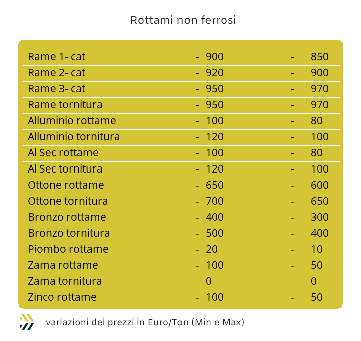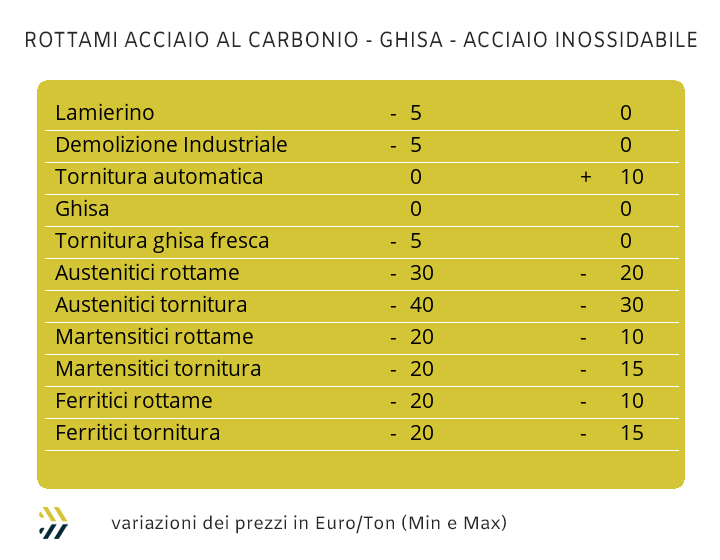 Le quotazioni dei rottami non ferrosi hanno avuto dei ricollocamenti così marcati verso il basso, portando i loro valori a non assumere delle dimensioni affidabili di mercato. I rottami direttamente riconducibili ai “rossi” sono al momento schiacciati da un valore medio classificabile in almeno 800 Euro per tonnellata di riduzione, dove a rendere ancora più ampio il dimensionamento negativo è entrato anche il gioco anche il fattore valutario. Le cose non sono certo migliori per l’Alluminio sebbene sia stato attivato un fattore importante di ponderazione del calo dei valori di tutti i rottami del raggruppamento per la scarsità dei lotti presenti “a terra” presso i piazzali dei commercianti italiani e europei e sicuramente non certo disposti a adeguare i prezzi che sul piano effettivo sarebbero di quasi meno 300 Euro per tonnellata, ma di considerare solo le “chiamate” di fonderie e raffinerie che si collochino in prossimità dei 100 Euro. La contrazione del valore di Borsa del Nichel, oltre a una fase di rimodulazione negativa del Molibdeno, ha portato alla riduzione dei prezzi dei rottami di inox austenitici e duplex entro un intervallo compreso tra i 20 e i 50 Euro/tonnellata a seconda delle composizioni delle leghe. Il quadro d’insieme per la filiera siderurgica a livello mondiale si complica se si allarga la visione sulle materie prime di origine, come il minerale di ferro, in crescita dell’1% alla Borsa Dalian in Cina e alla vera e propria impennata della quotazione del rottame HMS 1/2 in Turchia, registrando incrementi tra i 6 e i 10 Dollari per tonnellata. I prezzi italiani delle principali classifiche sono stati al momento non intaccati da questi importanti adeguamenti, in particolare dei rottami turchi, ma non mancherà molto che anche sulla nostra piazza si presenteranno delle riproposizioni al rialzo delle principali gamme di quotazioni. La settimana tutta italiana si è conclusa con una serie di riproposizioni negative nell’ordine di 5 Euro/tonnellata per le demolizioni leggere E3 e per il lamierino E8, sebbene sempre più ridotto nelle disponibilità, ma anche nelle richieste di acciaierie e fonderie. Una timida ricerca da parte delle mandatarie sulle demolizioni pesanti E1 e sulle torniture ha corretto al rialzo le quotazioni di 5 Euro per le prime e fino a 10 per le seconde, mentre il premio mulino per il rottame frantumato E40 è ora collocato in prossimità dei 45 Euro per tonnellata. Una sequenza di valori che ha portato alla determinazione conclusiva su base settimanale dell’indice MetalWeek™ a registrare un calo per tonnellata di 1,6 e a riportare il valore medio dei rottami acquistati da acciaierie e fonderie sotto la linea dei 330 e precisamente a 328,85 Euro. |